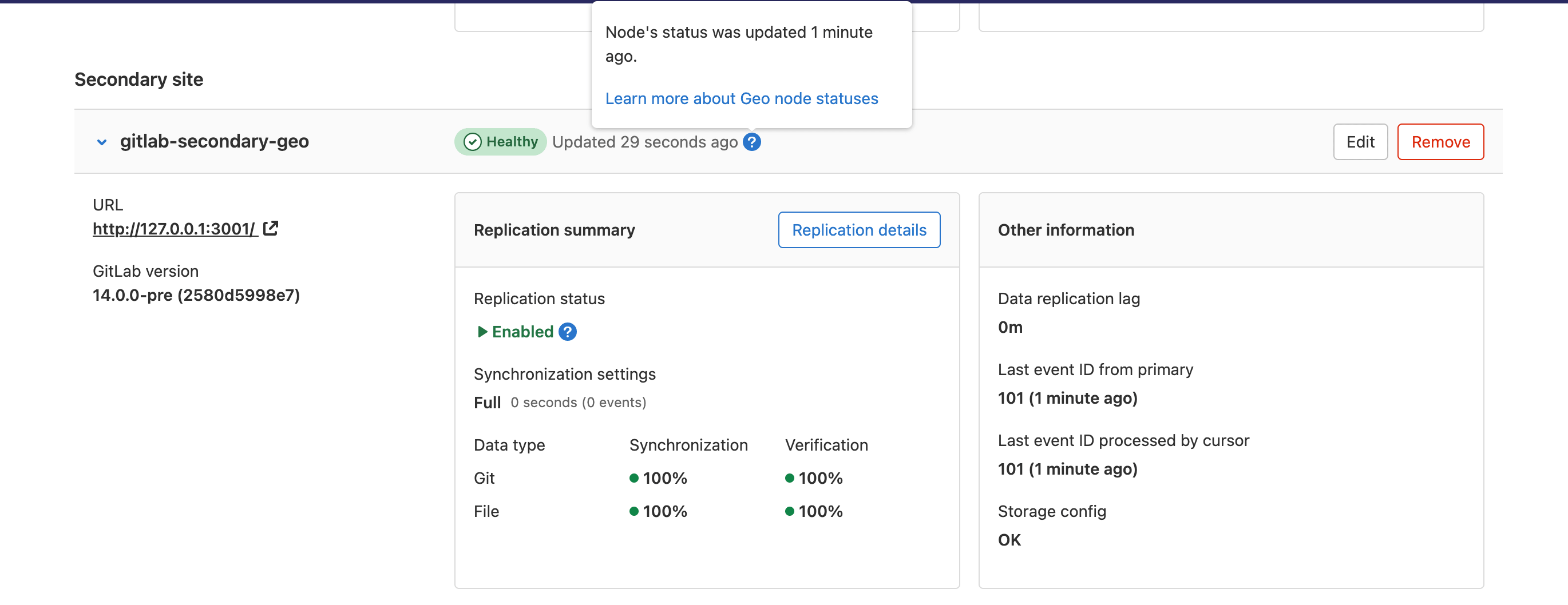 /var/log/gitlab/gitlab-rails/geo.logto see if the secondary node is using IPv6 to send its status to the primary node. If it is, add an entry to the primary node using IPv4 in the/etc/hostsfile. Alternatively, you should enable IPv6 on the primary node.