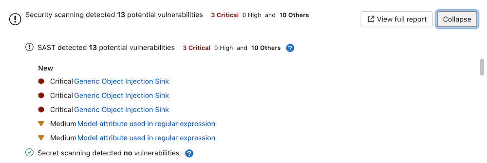 A merge request contains a security widget which displays a summary of the new results. New results are determined by comparing the current findings against existing findings in the target (default) branch (if there are prior findings).
