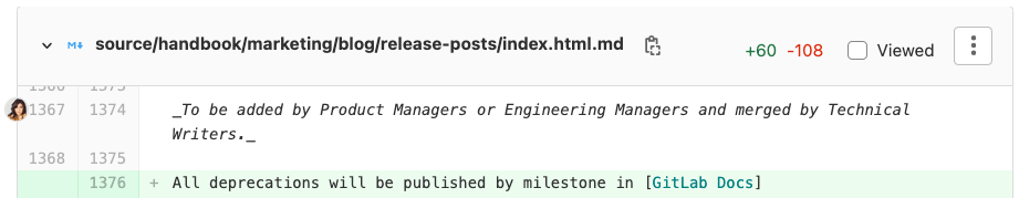 Whitespace changes can make it more difficult to see the substantive changes in a merge request. You can choose to hide or show whitespace changes: