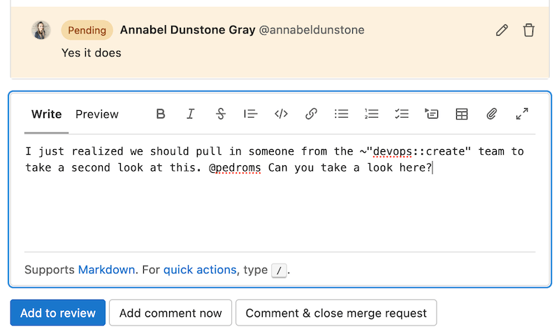 - Optional. You can use quick actions inside review comments. The comment shows the actions to perform after publication, but does not perform them until you submit your review.