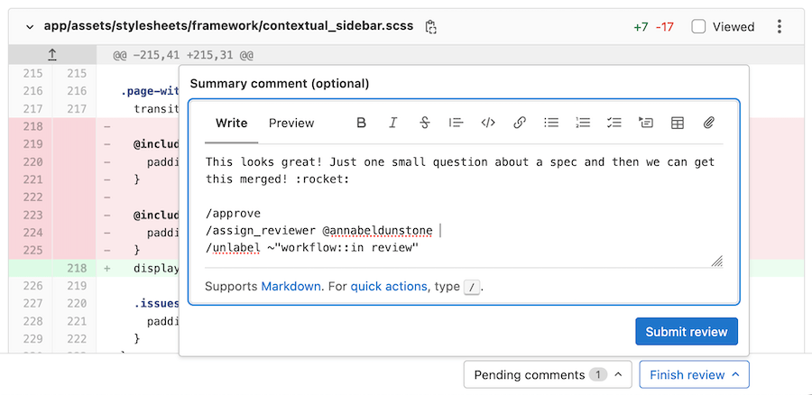 /submit_reviewquick action in the text of a non-review comment. - Select Finish review and then Submit review in the footer at the bottom of the screen.